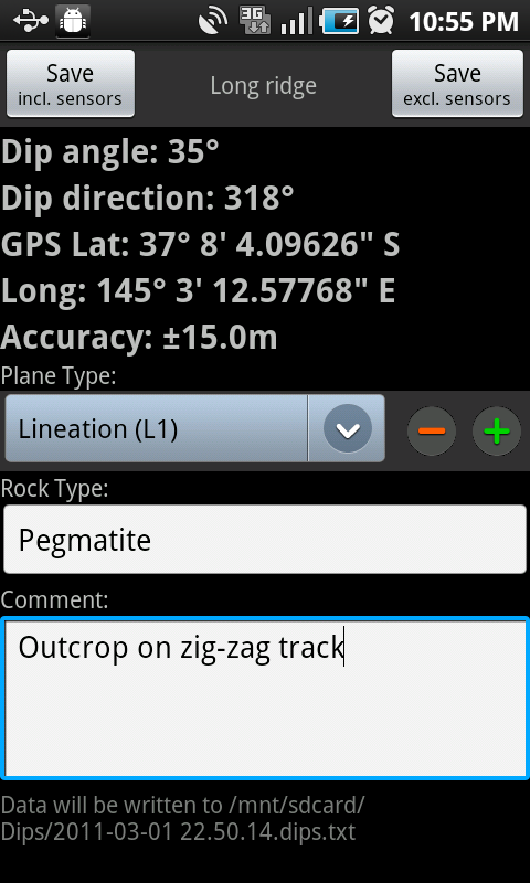 This will save all the information you have entered (plane type, rock type and comments), along with your current GPS location and accuracy, and the current time. The dip and magnetic fields in the log file will be left blank.