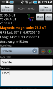 Although Rocklogger records the magnetic field (X, Y, Z & magnitude, in micro-tesla, uT) in both dip & dip direction and dip & strike modes anyway, in magnetic field mode the readings are shown on screen. The magnitude text changes to orange when the magnitude is greater than the earth’s magnetic field.